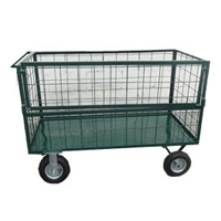 Carrinho Plataforma fabricado com assoalho de chapa de aço e com 4 abas em tela removíveis. Possui sistema 5ª roda, dotado de cabo de tração em forma da “T” com articulação. Capacidade para 800 Kg. Equipado com 4 rodas maciças.