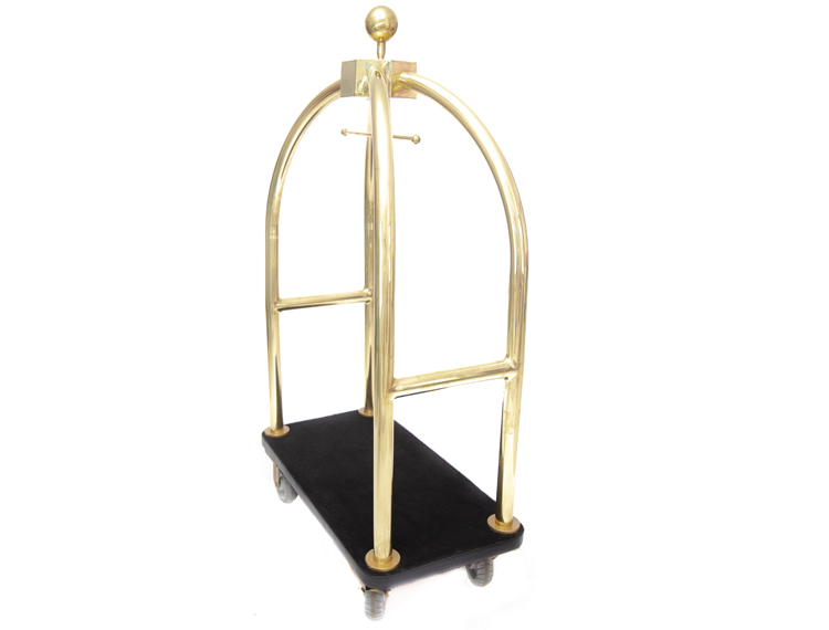 Carro/ Carrinho hotelaria para portaria todo em latão polido, acabamento impecável. Possui cabideiro. Assoalho acarpetado com resina e com proteção emborrachada em todo contorno. Equipado com 4 rodízios super macios de 6”, sendo 2 fixos e 2 giratórios, que simulam roda pneumática e minimizam ruído. Possui 110 cm de comprimento, 60 cm de largura, com aba de 198 cm de altura.
