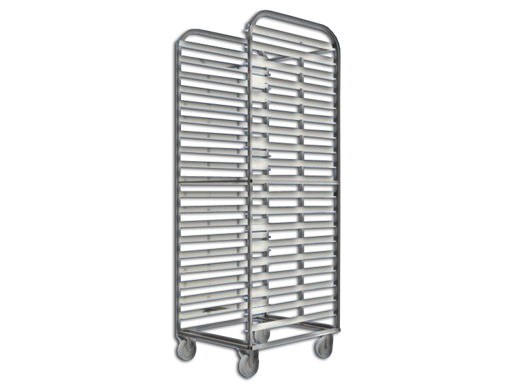 Carrinho esqueleto grande ou carrinho aberto. Com capacidade para 20 bandejas de alumínio. Bandejas não acompanham o produto, devendo ser adquiridas separadamente (cód. GEA 015, GEA 016, GEA 017 e GEA 018), com medidas 68 x 58 cm (CxL). Fabricado totalmente em aço inoxidável ASI 3014, com polimento espelhado. Equipado com 4 rodízios de 4” de inox, sendo 2 fixos e 2 giratórios. Possui 79 cm de comprimento, 65 cm de largura e 200 de altura.